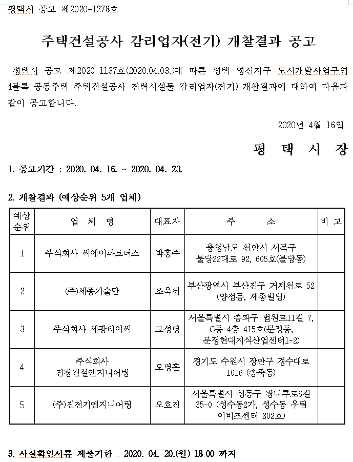 평택시 공고 제2020-1134호(2020.04.03.)에 따른