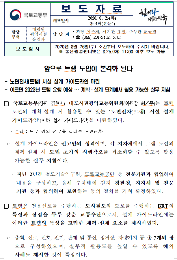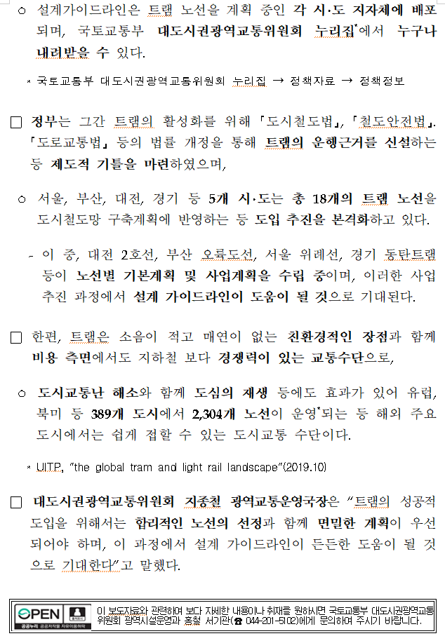 - 노면전차(트램) 시설 설계 가이드라인 마련