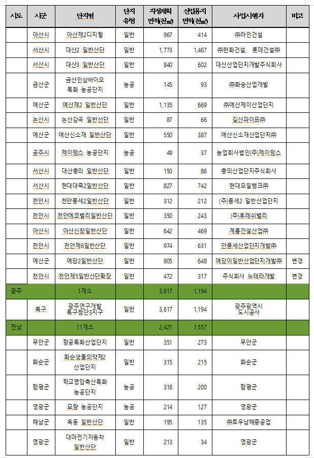 신규 또는 변경된 산업단지 12개소