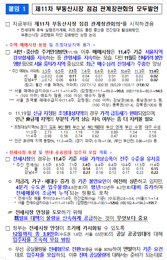 「제11차 부동산시장 점검 관계장관회의」를 개최하여