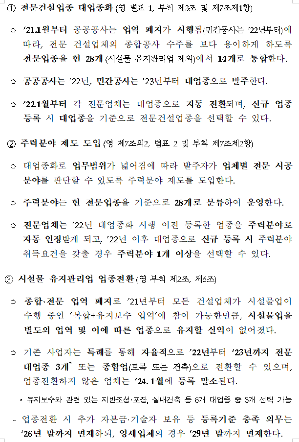 - 전문건설업의 대업종화(28개→ 14개),