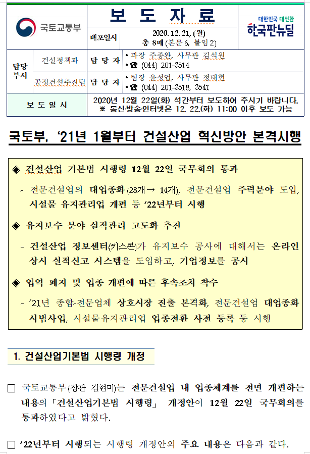 - 건설산업 업종체계 개편 본격화는