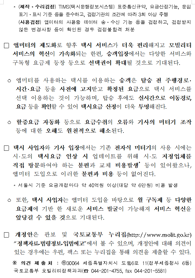 GPS 기반 택시 앱미터를 제도화하는 내용의