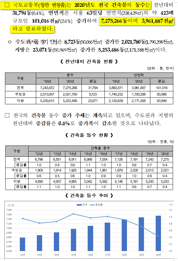 7,275,266동이며 3,961,887천㎡라고
