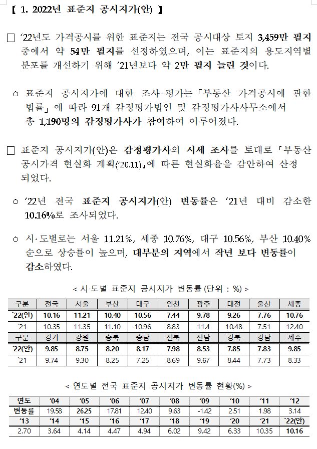 2022년 표준지 공시가격 및