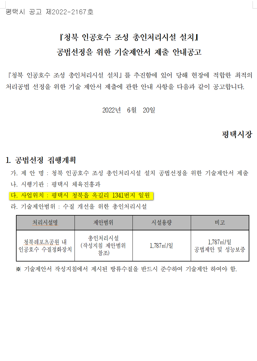 『청북 인공호수 조성 총인처리시설 설치』를