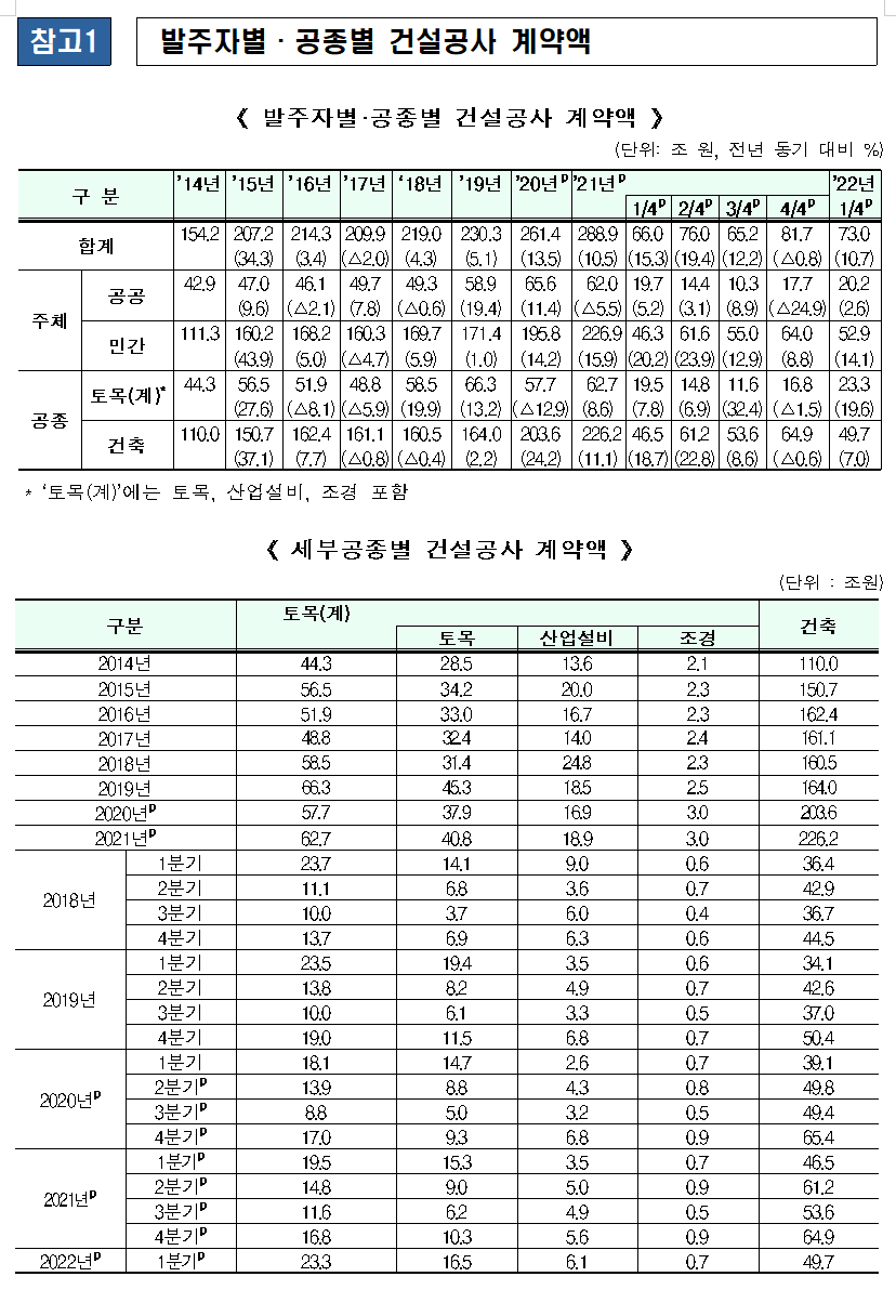 2022년 1분기 건설공사 계약액 73조 원…