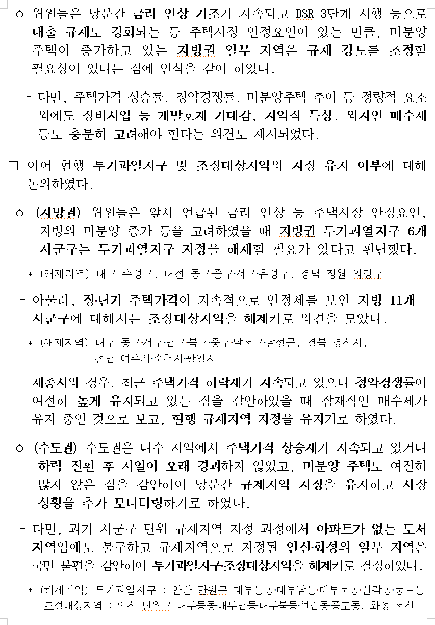 - 지방 투기과열지구 해제 등 규제지역 조정