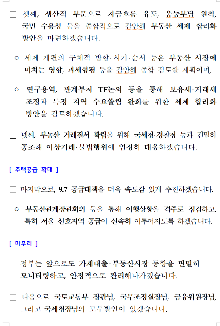 □ 금일 발표된 "주택시장 안정화 대책"의
